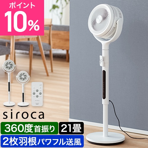 2枚羽根でパワフル送風ができる「siroca フィルター付きサーキュレーター扇風機」。約14m先まで送風し、約21畳のお部屋を扇風機として涼しく、サーキュレーターとして空気循環します。部屋干しにも効果的な360度 自動首振り対応。風量調節8段階、オン/オフタイマー、3つのモードなど、便利に使える機能つき。背面フィルターつきで、羽根やガードの汚れを抑制します。