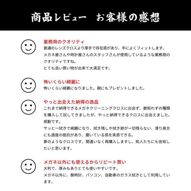◆独自の「超極細繊維の織編構造」 ◆洗濯にも強く、汚れても洗濯すればふき取り性能は元通り ◆繰り返し使うことができ、環境にもお財布にもやさしい ◆伸縮、摩擦に強くほころびや破損などがしにくい ◆ミクロの汚れを嫌うハイテク・エレクトロニクス産業で高い評価を得た本物のクリーナー ◆おすすめ利用シーン・・・メガネ、スマホ、宝石、時計、ジュエリー、アクセサリー、クリーンルーム用ワイピング、洗顔、鏡、ステンレス、蛇口、洗面台、台所 ◆鯖江のメガネ工場で職人が使っているメガネ拭きです。弊社にも複数枚、常備されております。 ◆洗顔でお顔を洗い流す際にも使えます。ただし刺激や違和感を感じる場合は使用を中止してください。