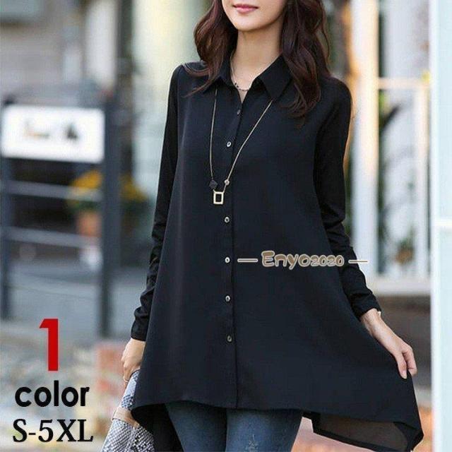 シャツ レディース 長袖 ロング チュニック ロングシャツ 春 夏 秋 冬 ワイシャツ 襟付き aライン 大きいサイズ ゆったり 透け感 黒
