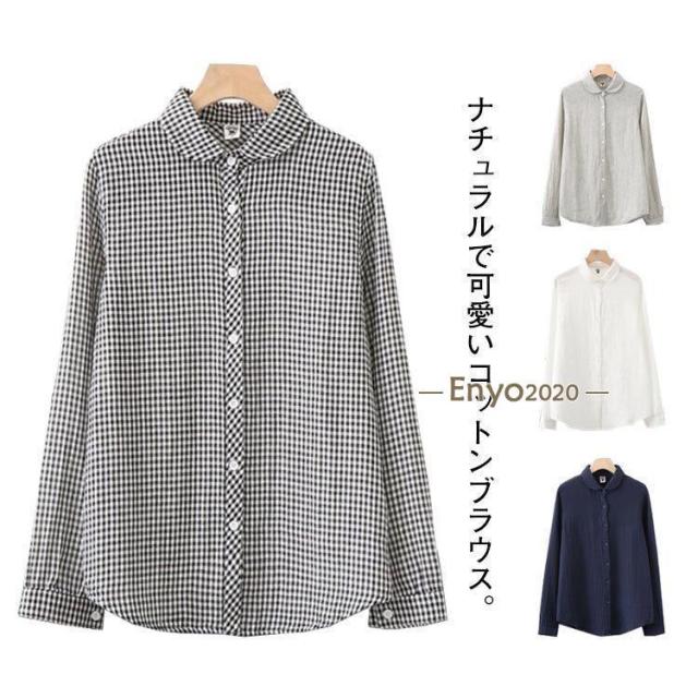 綿シャツ ブラウス レディース 丸襟 長袖 トップス シャツブラウス カジュアル 無地 チェック 折り襟 春 秋 柔らかい 大きいサイズ 体