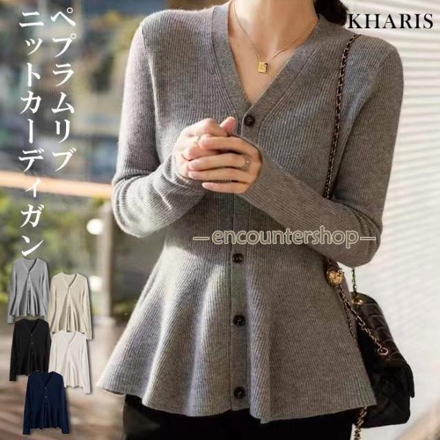 ペプラムリブニットカーディガン カーディガン ニット リブニット ペプラムトップス ペプラムカーディガン vネック 長袖 ボタン 羽織 体型カバー
