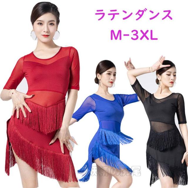 半袖 ラテンダンス衣装 ラテンドレス 膝丈 フリンジドレス 社交ダンス イレギュラー裾 ドレス 女性 大人 ラテンダンス 演出服 大きいサイズドレス シースルー