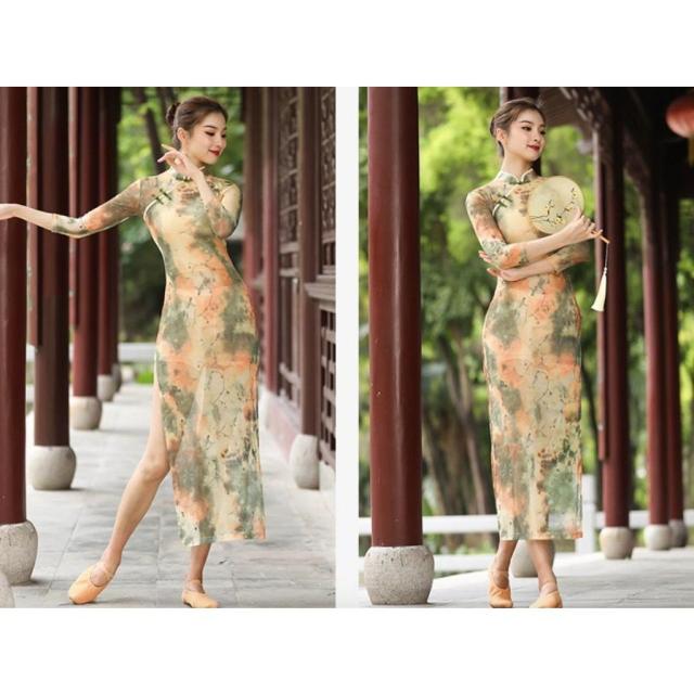 ダンスウエア衣裳チャイナドレス レディースワンピース中華風ロングドレス七分袖スタンドカラー社交ダンス演出服モダンドレス花柄プリント舞台全店二点送料無料