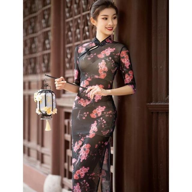 チャイナドレス レディースワンピース ダンスウエア中華風ロングドレス中袖スタンドカラー 社交ダンス モダンドレス花柄プリント演出服 舞台 全店二点送料無料
