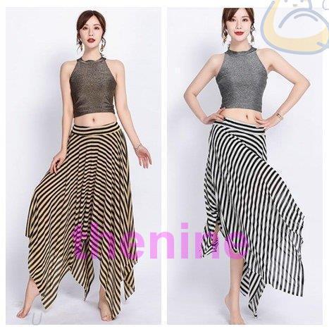 ベリーダンスダンス衣装レディース2点上下セットレッスン着ノースリーブトップスとロングスカート社交ダンスラテンダンスストライプ柄