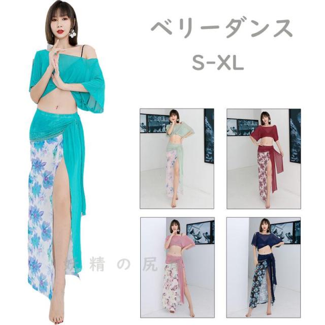 ベリー ダンス衣装 セットアップ ベリー レッスン着 へそ出しトップス 花柄 ロングスカート ハイスリット チュール 舞台演出服 練習着 学園祭 文化祭