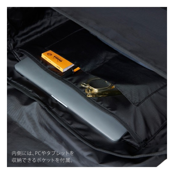 内側にPCやタブレットを収納できるポケットを付属しています。