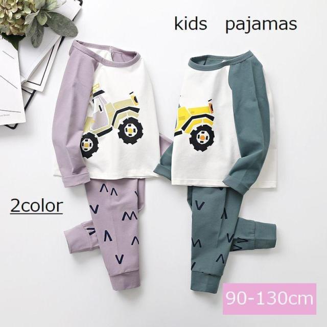 子供用パジャマ キッズ セットアップ 上下セット 2点セット ルームウェア 長袖 トラクター 重機 車 くるま プルオーバー 長ズボン ロングパンツ