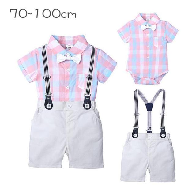 セットアップ 3点セット ロンパース 半ズボン サスペンダー ベビー 子供用 キッズ 男の子 半袖 蝶ネクタイ シャツ風 チェック柄 かわいい おしゃ
