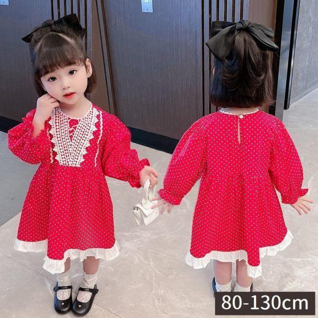 ワンピース 長袖 キッズ ベビー 子供服 膝丈 Aライン フレア レース フリル ラウンドネック ドット柄 かわいい ガーリー おしゃれ 女の子 女児