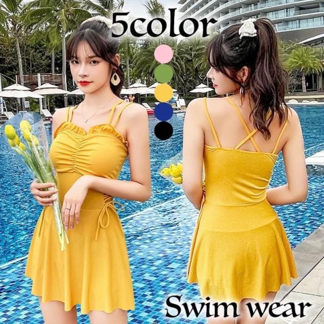 水着 ワンピース レディース スイムウエア 無地 フリル フレアスカート パッド付き 一体型 オールインワン レースアップ 体型カバー カップ付き プ