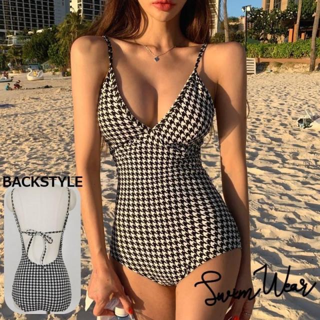 水着 ワンピース レディース 女性用 スイムウェア オールインワン 千鳥格子 Uバッグ 肩紐調節可能 背中見せ モノクロ セクシー かわいい 大人可愛