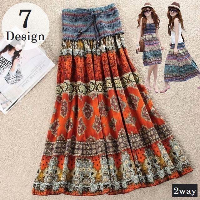 ロングスカート フレア レディース チューブトップワンピース 2WAY エスニック風 アジアンテイスト ボトムス 花柄 ペイズリー柄 総柄 おしゃれ
