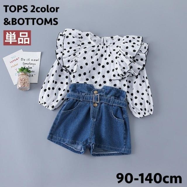 ブラウス デニムパンツ 単品 キッズ ジュニア 子供 女の子 長袖 ラウンドネック 肩フリル ウイングショルダー ショートパンツ ハイウエスト 短パン