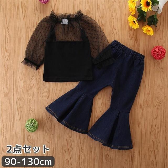 セットアップ 2点セット 長袖シャツ ミニスカート キッズ ベビー 女の子 シースルー ドット ブラック シック 上品 可愛い お洒落 秋 80cm