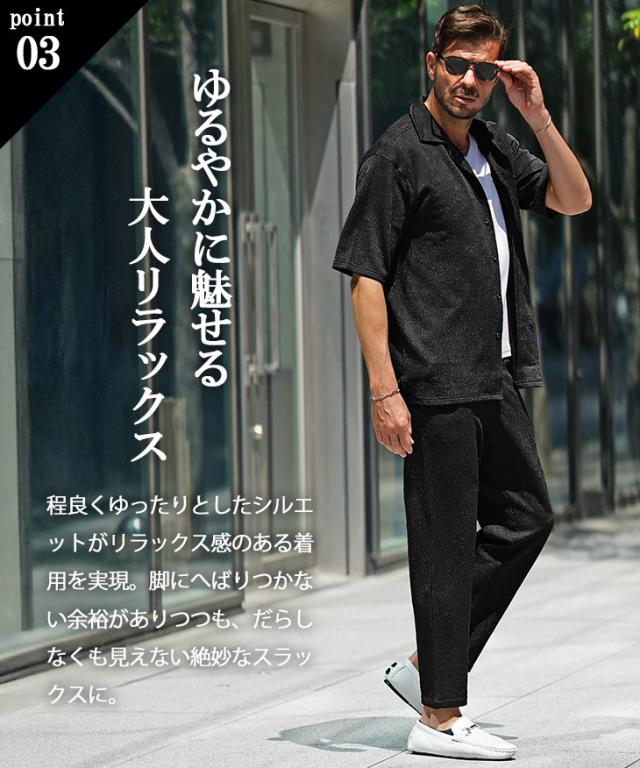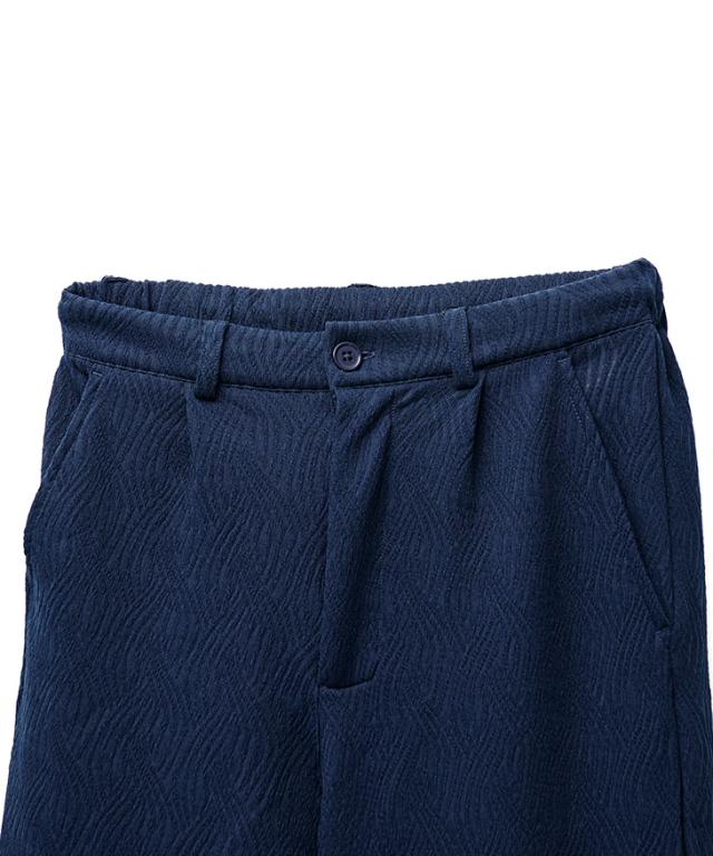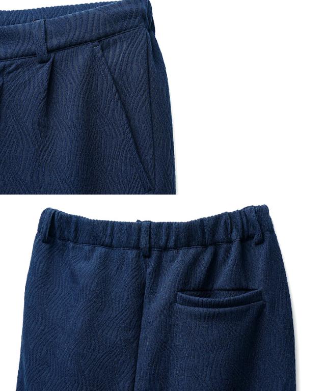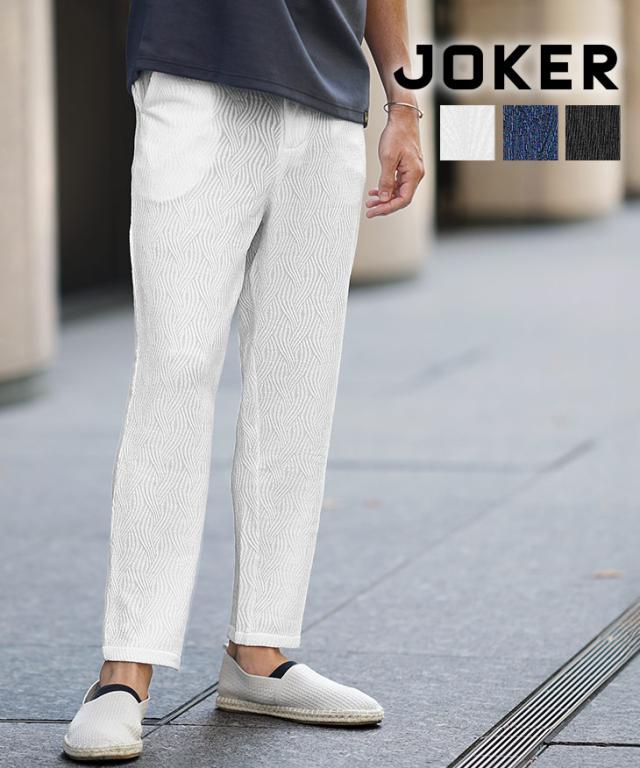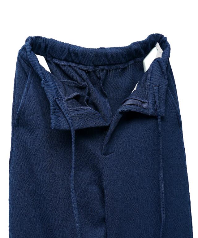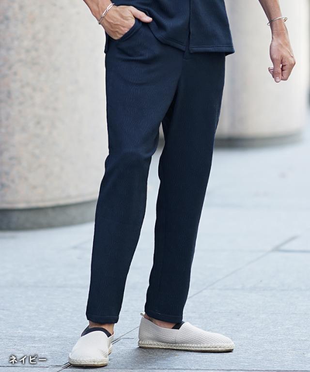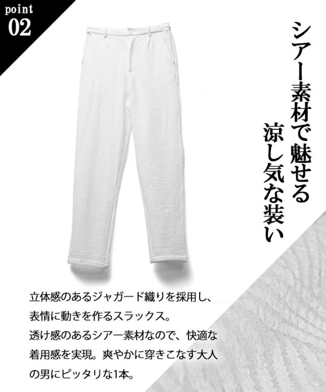 軽快に穿きこなす大人リラックス『ジャガードイージースラックス』【ジャガードイージースラックス】■Design/デザイン大人の余裕を軽やかに穿きこなすイージータイプのスラックス。透け感のある薄手な素材感で仕上げることで、汗ばむ季節も軽快な穿き心地を実現。程よいリラックスシルエットで、窮屈さを感じさせない佇まいに。ジャガード織りで生地全体に柄をデザインし、さりげなく存在感を発揮するのもポイント。ラクに穿けて上品顔、まさにデキるオトナのための一本。■Material/素材感ポリエステルを使用した、程よくしっとりとした生地感が特徴。薄手の素材感であるだけでなく、伸縮素材を採用することで、ストレスフリーな着心地を楽しめる。
