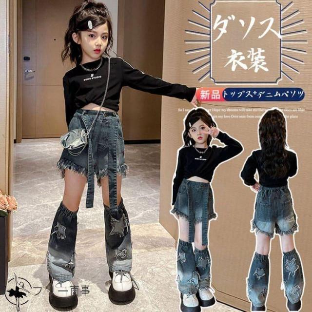 ダンス衣装 セットアップ 子供服 女の子 白 黒 k-pop デニムパンツ レッグウォーマー ジャズダンス キッズダンス衣装 デニム パンツ 普段着 へそ出し
