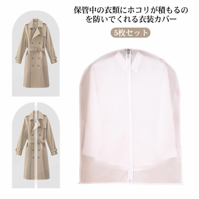 | 大切な服やクリーニングから戻ってきた服をホコリから守る衣類カバー5枚セット。 背面は通気性に優れた不織布、前面は透明フィルムで中身が一目で分かります。 洋服の上からすっぽりかぶせるだけ!衣類の衣替えなどにとっても便利◎ 大切な衣類をホコリやごみから守ります。 種類ごとに分類して収納することができます。 ワンピース、コート、冬物の厚手の衣類やフォーマル用の衣類などの保管にも最適です。 | |