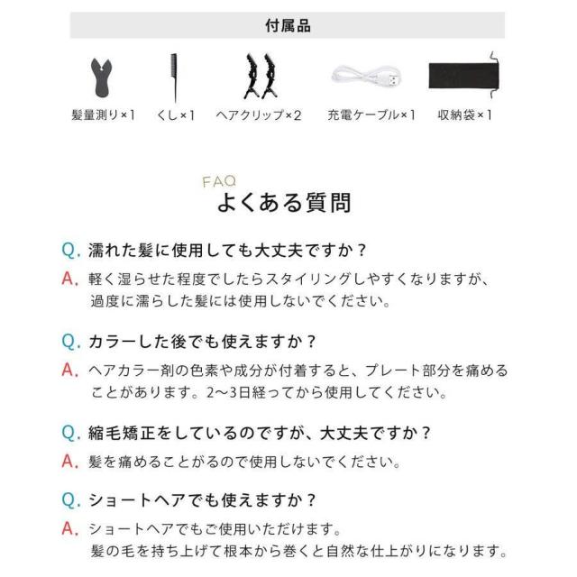 付属品 髪量測り×1、くし×1、ヘアクリップ×2、充電ケーブル×1、収納袋×1