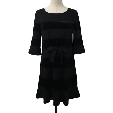 【中古】ストロベリーフィールズ ワンピース フレア ミニ ボーダー ベロア 七分袖 黒 ブラック レディース