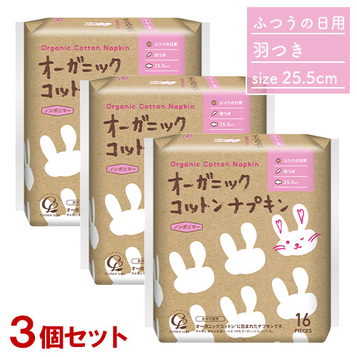 オーガニックコットンナプキン ふつうの日用 羽つき25.5cm 16個入り×3個セット 基本サイズ コットン・ラボ(Cotton labo)【送料込(北海道除く)】