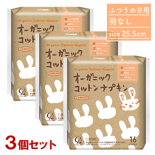 オーガニックコットンナプキン ふつうの日用 羽なし25.5cm 16個入り×3個セット 基本サイズ コットン・ラボ(Cotton labo)【送料込(北海道除く)】