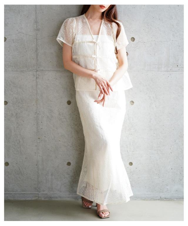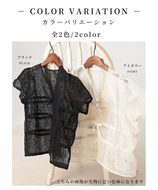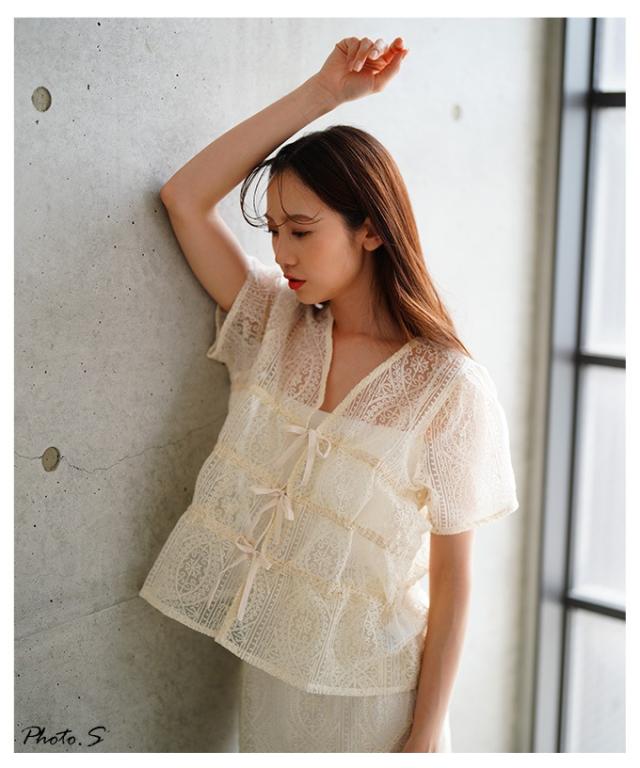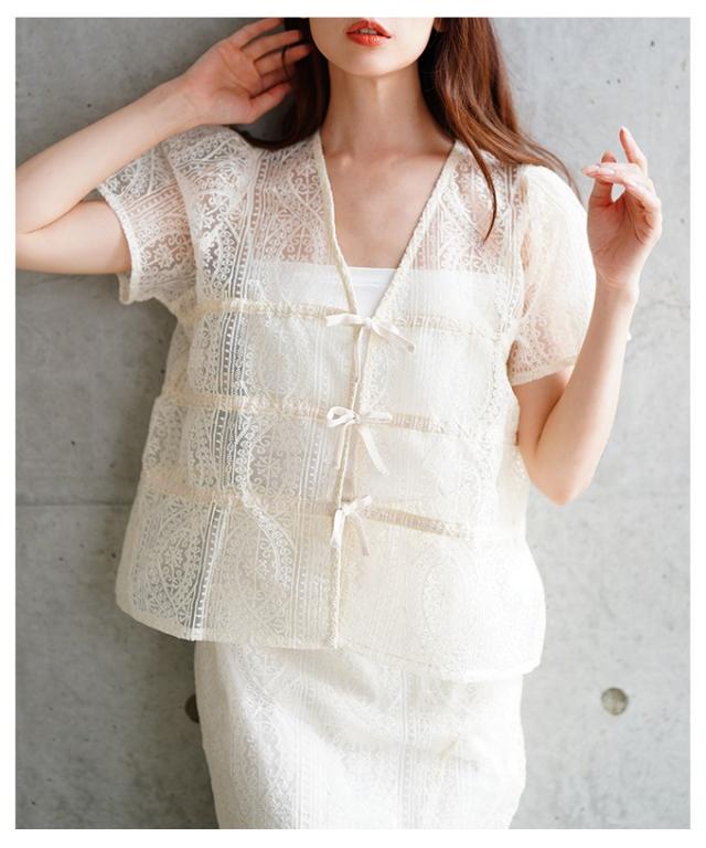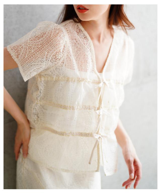 特徴: レース リボン シャーリング ギャザー ノーカラー ボタンレス シアー