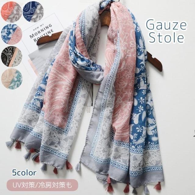 ガーゼストール ガーゼマフラー レディース 女性 ペイズリー柄 民族的 タッセル付き カジュアル おしゃれ UV対策 紫外線対策 日焼け防止 薄手 春