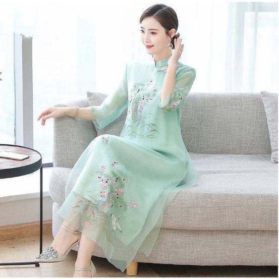 チャイナドレス風ワンピース ロング丈 半袖 アオザイ風ワンピース 夏 マキシチャイナ風ワンピース チャイナドレス 2点セット ワンピース 40代