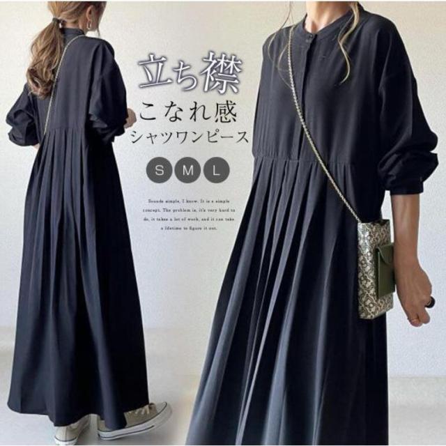 ワンピース マキシワンピース レディース 長袖 春 秋 無地 シャツワンピース 立ち襟 Aライン フレア ワンピース 大きいサイズ 着痩せ ゆったり 体型カバー