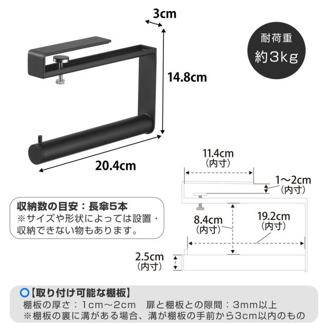 | 対応サイズ | 収納数の目安:長傘5本 ※サイズや形状によっては設置・収納できない物もあります。 |