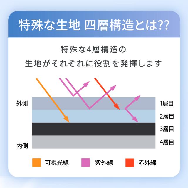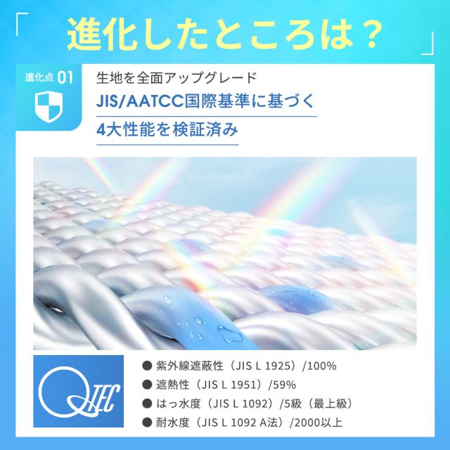 JIS/AATCC国際基準に基づいた生地を採用し、紫外線カット率・遮光率ともに100%。日差しや紫外線から肌をしっかり守ります。