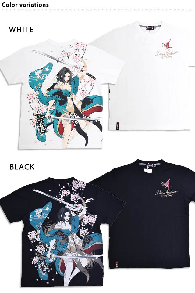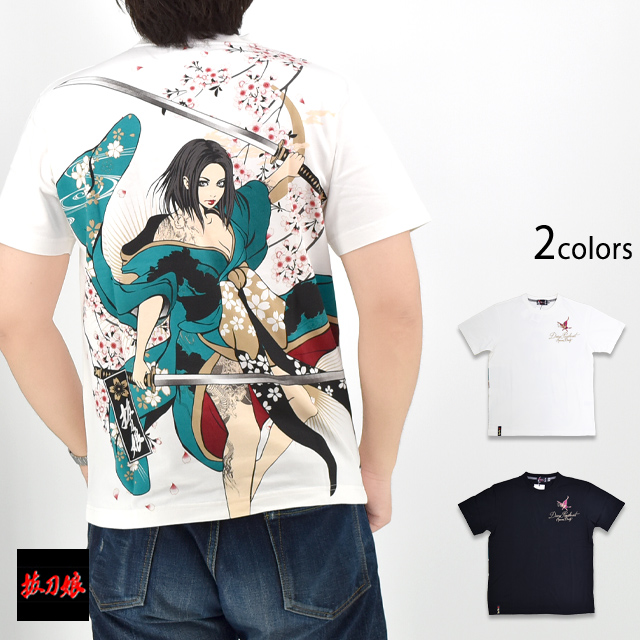絡繰魂の姉妹ブランドとして誕生した、従来の和柄から抜け出し、和の持つ美しさを融合させた【抜刀娘】から「抜刀娘 凛暴威半袖Tシャツ(252138)」のご紹介です。 今回モチーフの主役に採用されたのは、美しい凛。 背中には二刀流姿の凛をダイナミックにプリントしました。 フロントには蝶レタードをワンポイントで刺繍。 | |||||||||||||||||||||||||