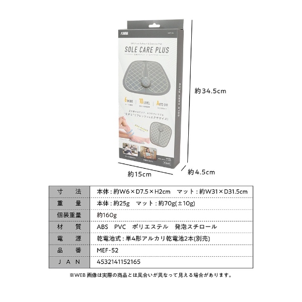 マットに乗るだけで、いつでも足裏のリフレッシュが可能な乾電池式EMSマットです。 モード6種類、強さ10段階からお好みのレベルでご使用いただけます。 ■寸法: 本体 : 約W6×D7.5×H2cm マット : 約W31×D31.5cm ■重量: 本体 : 約25g マット : 約70g(±10g) ■材質:ABS PVC ポリエステル 発泡スチロール ■電源:乾電池式 : 単4形アルカリ乾電池2本(別売) ■品番:MEF-52 ※記載は商品仕様の一部です。仕様説明不足等の理由での返品はできません。特に適合等は必ずご確認ください。