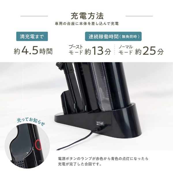 充電式でハンディタイプのサイクロン式強力クリーナーです。 H13 HEPAフィルター搭載で、0.3μmのゴミを99.98%除去。 付け替え可能なノズル4種&専用の充電台座が付属します。 ■寸法: 本体:約W7×D7×H44.5cm 台座セット時:約W8×D22×H45cm ■コード長:約180cm ■重量:約630g ■材質:ABS MABS PVC ■電源:充電式(アダプタ付属) ■アダプタ:AC100-240V 50/60Hz DC 14V500mAh ■消費電力:8W(充電時) ■内蔵充電池:リチウムイオン電池 11.1V 2000mAh ■充電 / 稼働時間: 約4.5時間充電(満充電)で ブーストモード:約13分、ノーマルモード:約25分稼働(無負荷時) ※時間は使用環境(使用期間や使用モード)によって異なります。 ■吸引力:最大約5kPa(ブーストモード時) ■集じん容量:約220ml ■品番:MEH-180 ※記載は商品仕様の一部です。仕様説明不足等の理由での返品はできません。特に適合等は必ずご確認ください。