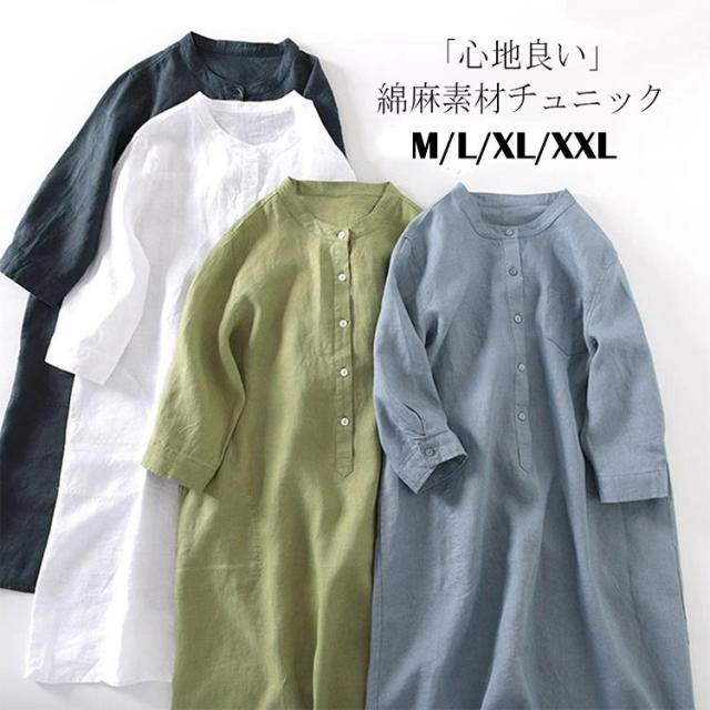 チュニック トップス レディース 七分袖 シャツワンピース ワンピース 麻 春 きれいめ リネン風 ロングワンピース 無地 ロングワンピ シャツ ワンピース 膝丈 シャツワンピ 春夏 ブラウス トップス 大きいサイズ 大人 ゆったり シンプル おしゃれ