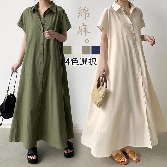 シャツワンピース レディース 夏 ワンピース リネン風 折り襟 半袖 ロングワンピース 無地 韓国風 ゆったり 通勤 カジュアル 大きいサイズ 春コーデ