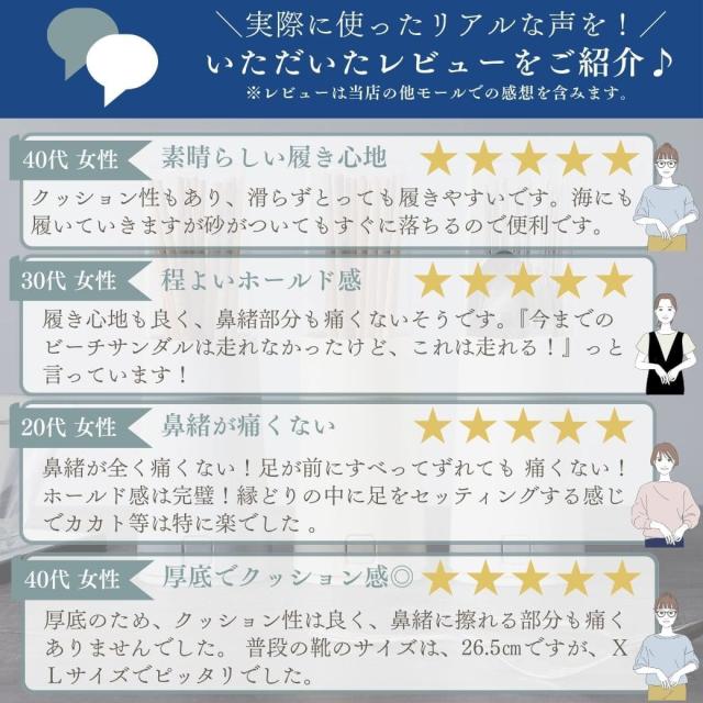 ・特徴:厚底で疲れない!おしゃれで痛くないビーチサンダル。厚底設計で長時間の使用でも疲れないビーチサンダルです。鼻緒が一体型になっているので痛くなりにくく、疲れにくい厚底のソールからリカバリーサンダルとしても人気です。室内や屋外の普段履きや、ビーチやプールの水遊びにも使える滑り止め付きのビーチサンダルになっています。軽量仕様も人気のビーチサンダルです。