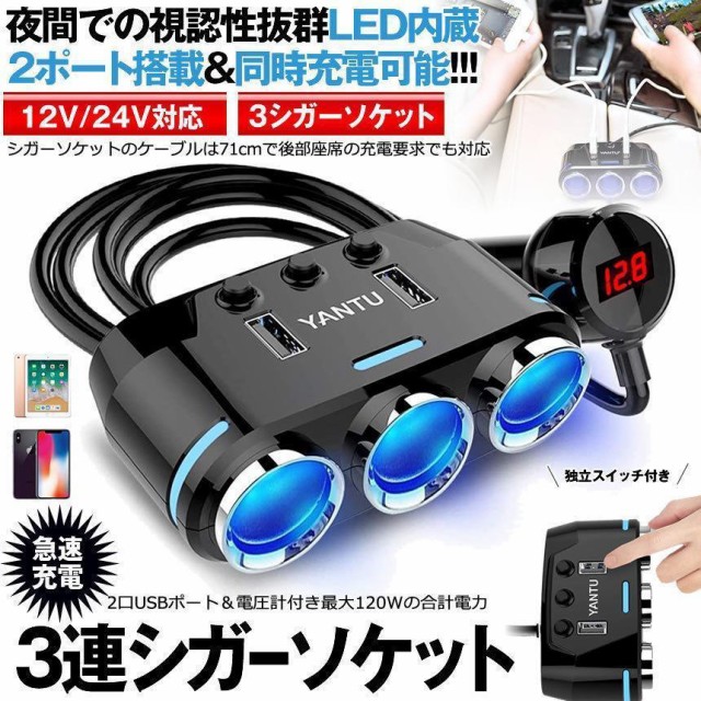 シガーソケット分配器 3連 2口 USBポート 増設 カーチャージャー 電圧計 車載充電器 12V 24V 対応 カー用品 自動車 急速充電QC3.0 LED付 SOKE32