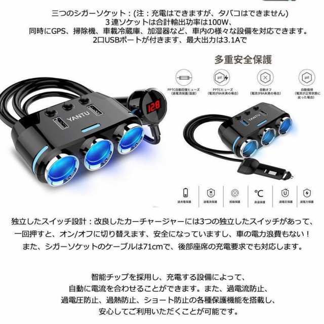 独立したスイッチ設計:改良したカーチャージャーには3つの独立したスイッチがあって・一回押すと・オン/オフに切り替えます・安全になっていますし・車の電力浪費もない! また・シガーソケットのケーブルは71cmで・後部座席の充電要求でも対応します。
