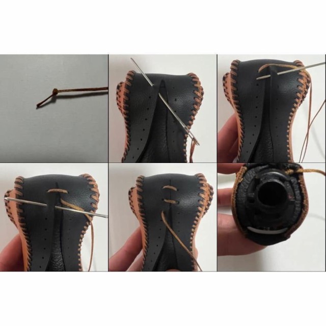 商品に取説は付属していません。シフトノブカバーは付属の糸、針で裏面を加工する必要があります。 画像5取付について。最初に玉結びを作り画像のように縫い合わせていきます。最後に玉止めを作り終了です。参考にどうぞ。