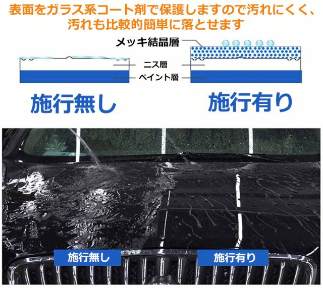【特徴】乾燥後、硬化・ガラス結晶化、強力撥水長期間持続ガラス被膜を形成し、塗装を保護します。表面硬度も驚異の硬度9Hです。キズもつきにくく汚れも付着しにくくなっています。表面をガラス系コート剤で保護しますので汚れにくく、汚れも比較的簡単に落とせます。【紫外線対策】紫外線に対しても強いので劣化もしにくくなります。劣化したヘッドライトやテールランプを綺麗にしても、そのままではまたすぐに元に戻ってしまします。