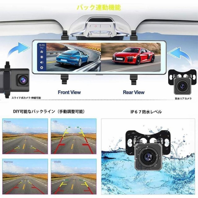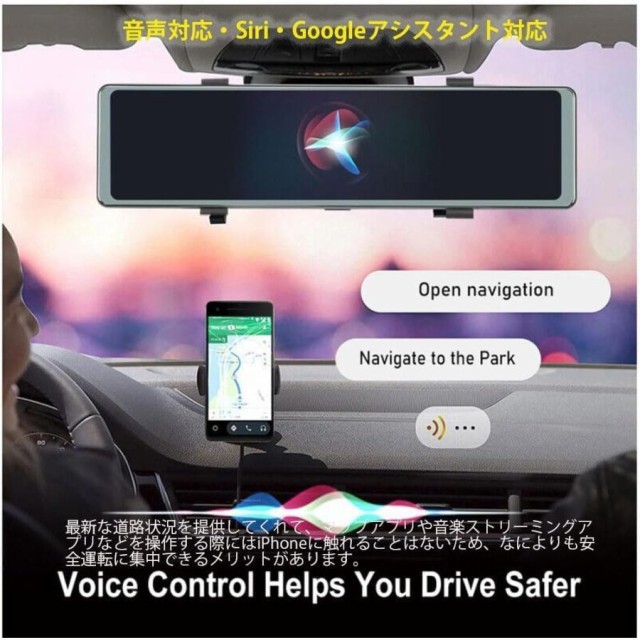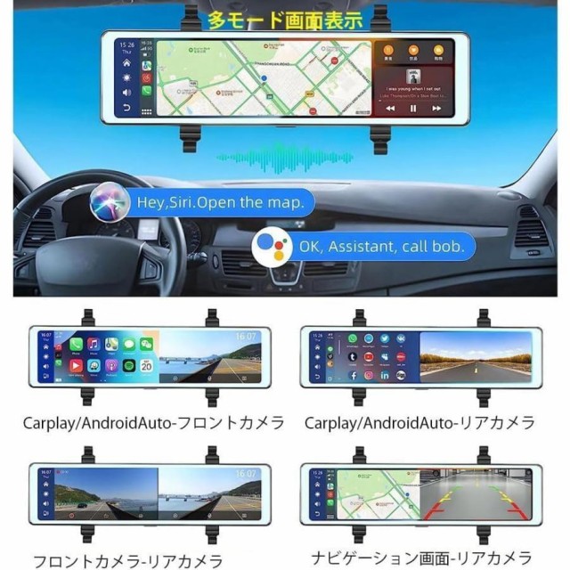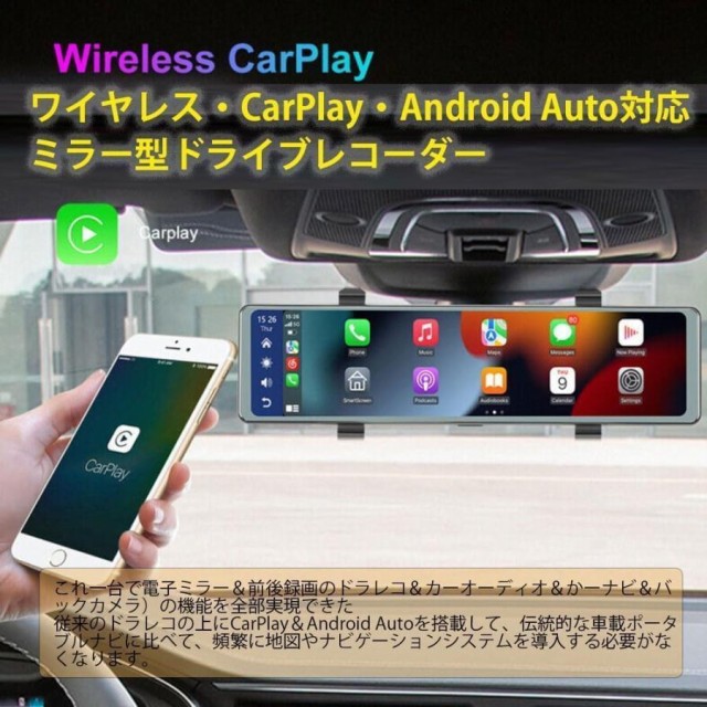 ミラー型ドライブレコーダー ワイヤレスCarplay AndroidAuto対応 12インチ大画面IPS液晶画面 ポータブルナビ 高画質 2カメラ同時録画 2.5K高画質