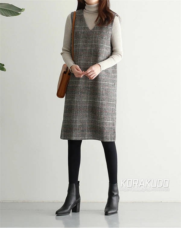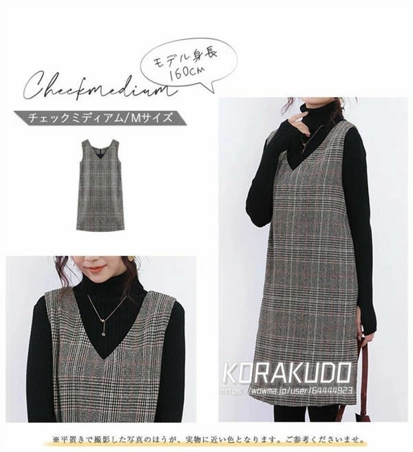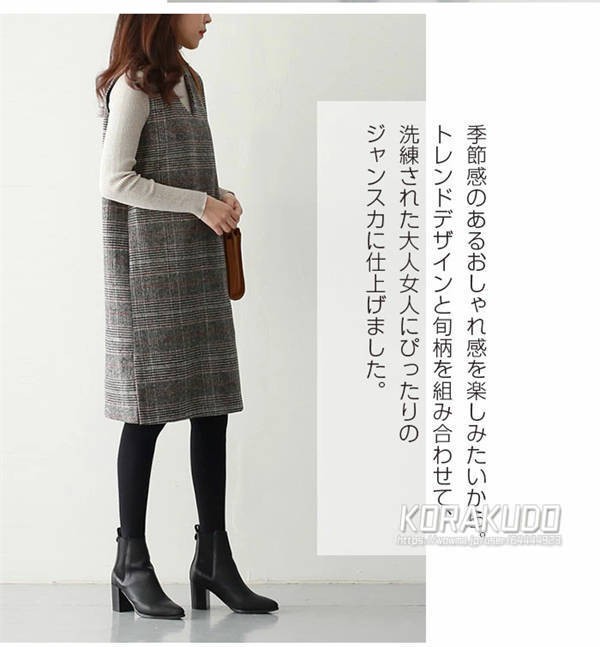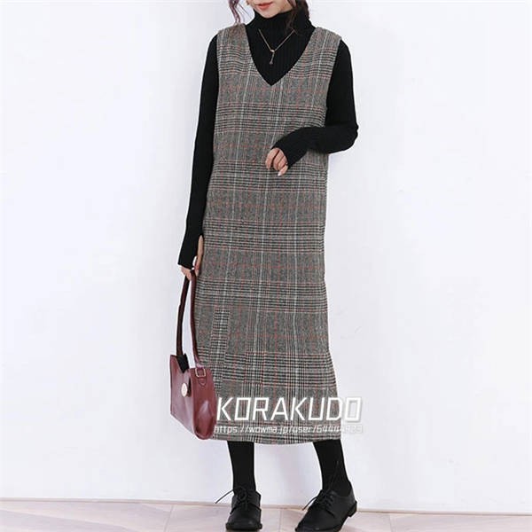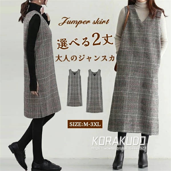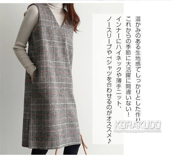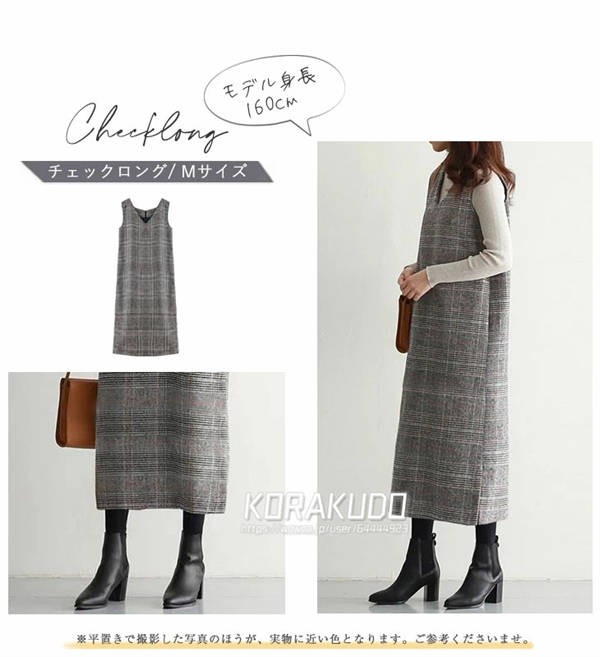 ジャンパースカート ロング丈 ミディアム丈 ノースリブ vネック チェック柄 カジュアル フォーマル オフィス 通学 通勤 秋 冬 グレンチェック