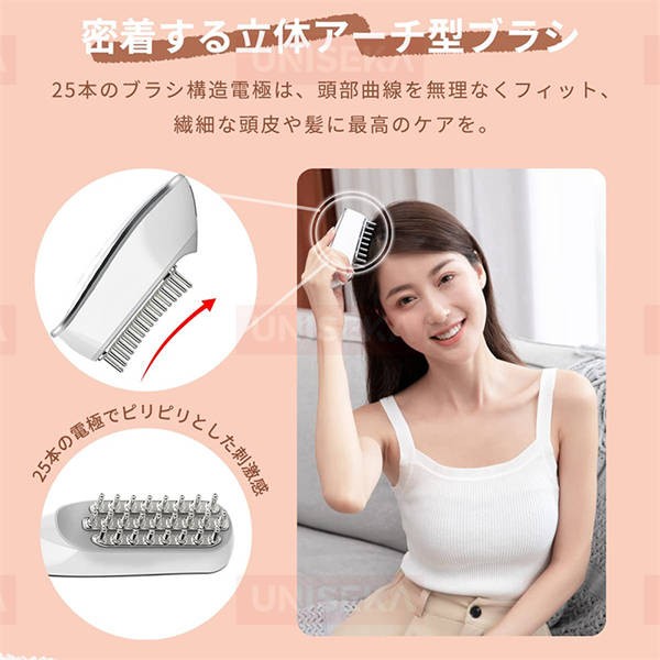 頭部曲線を無理なくフィットし、繊細な頭皮や髪に最高のケアを、また、25本のブラシ構造電極でピリピリとした刺激感を与えます。