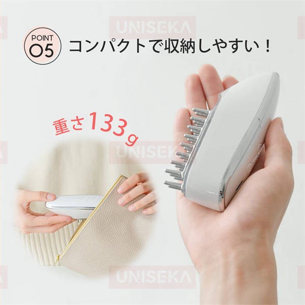ブラシはより握りやすくのために設計され、ずっと持っていても疲れにくい仕様です。また、コンパクトなサイと僅か133gの重さで旅行や出張にも携帯便利です。