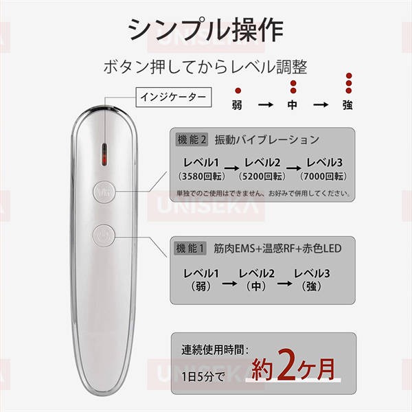 振動強度三段階調節可能、1分間で約3580回、5200回、7000回の振動で、使用上にニーズに合わせて自由調節、今までにない新しい体験をしていただきます。