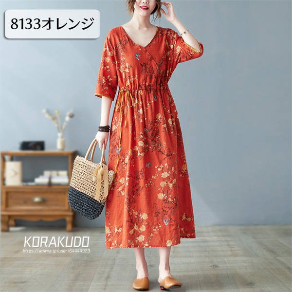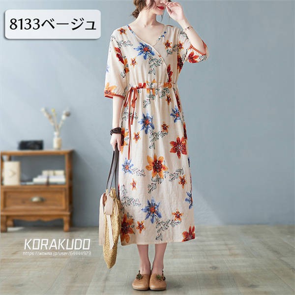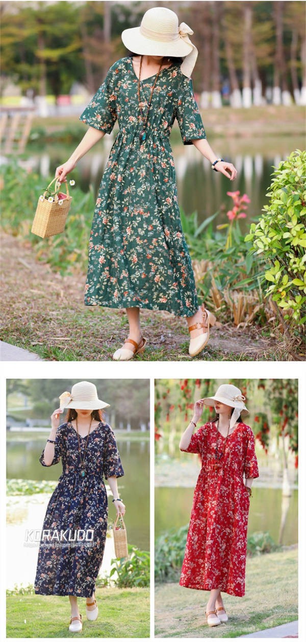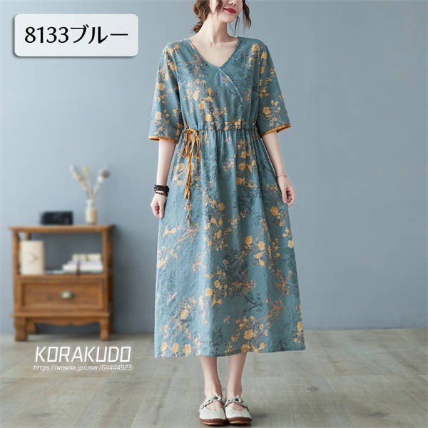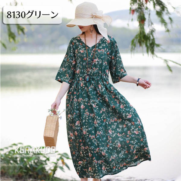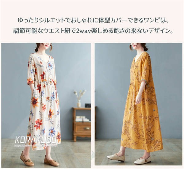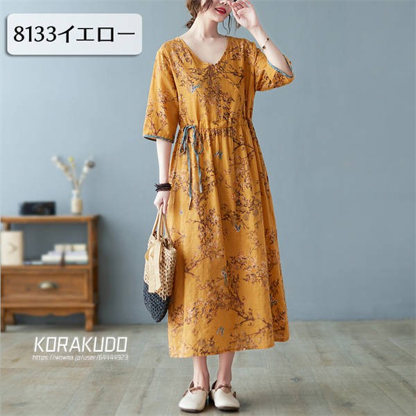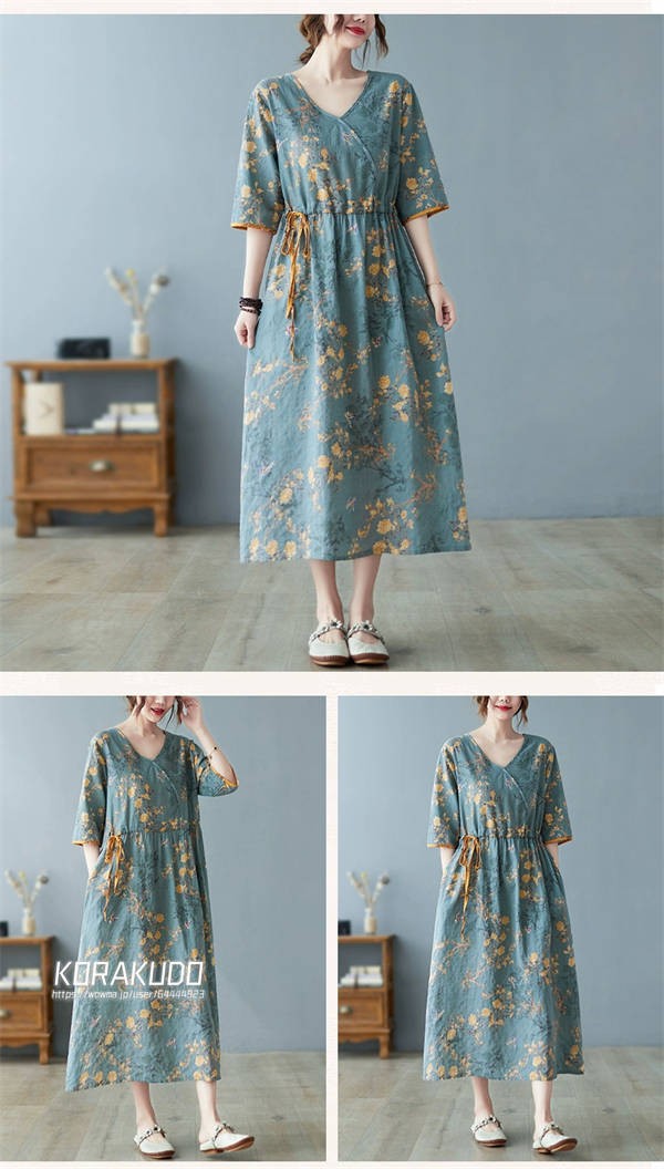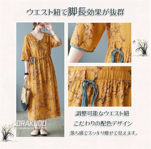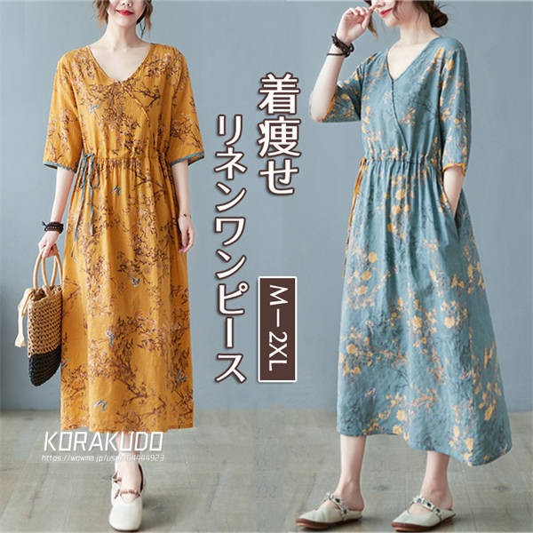リネン混 ワンピース フレンチスリーブ ウエストゴム 綿麻 リネン混 ワンピース ロング マキシ A ライン ウエストシャーリング ワンピ レディース リネンワンピース