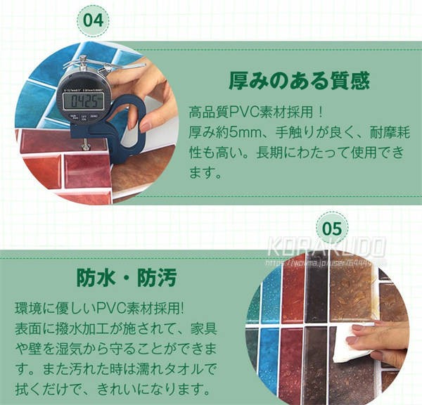 ◆ 撥水加工が施されて、変色や変形がしにくいです。キッチン、洗面所、お風呂場など様々な場所に施行可能。