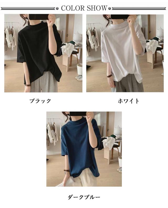 綿 ゆったり 5分袖カットソー カットソー Tシャツ レディース 半袖 5分袖カットソー 夏 tシャツ 夏服 ドロップショルダー ハイネック トップス 女性 大人 モックネック 5分袖 着?せ 体型カバー 大きいサイズ トップス シンプル 通勤 薄手 無地